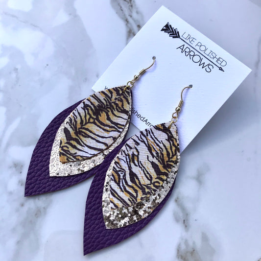 Purple and Gold Faux Leather Triple Layer Feather Earrings