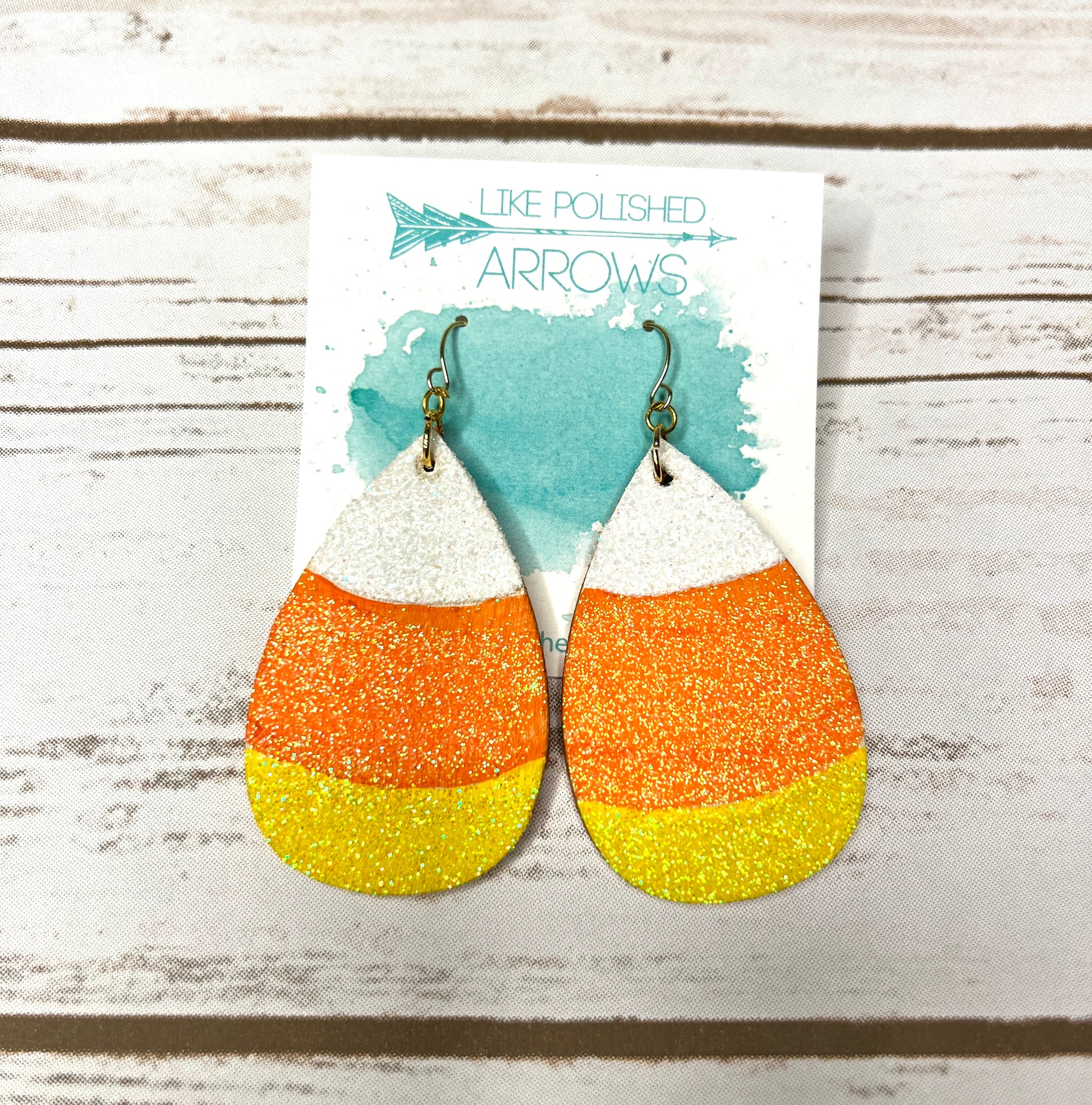 Actual ear candy! Enjoy these hand painted glitter wooden candy corn teardrop earrings, perfect for fall outfits, Halloween and every day! Lightweight and eye catching. Hangs on gold plated fish hook ear wires. About 2”.