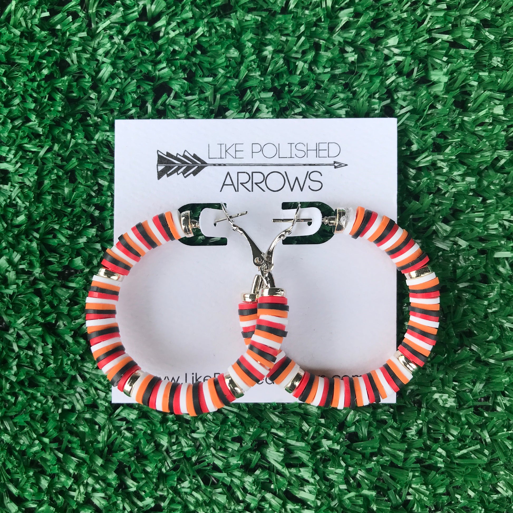 Support the Cajuns with these super-trendy Heishi Hoops! Light-weight and on latch-closure silver-plated hoops. 2.5"
